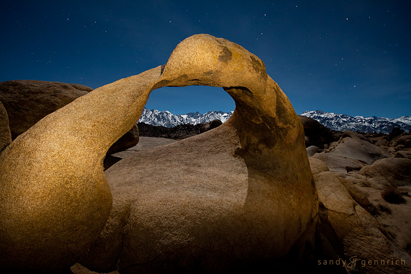 1. Clear Night in the Sierras. This was taken at Mobius Arch in the Alabama Hills on a clear night with a full moon. We light painted the arch with our flashlights. The full moon provided the light for the snowy mountains.